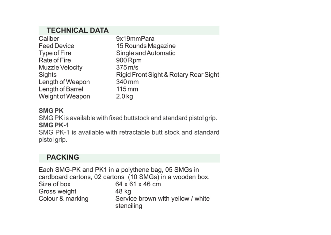 SMG PK is one of the most reliable and compact sub machine gun in production at the Pakistan Ordnance Factories. Based on the famous I-18K delayed roller locked blowback system, this 9mm sub machine gun can be employed for Close Quarter Battle (COB) and is popular among military personnel, signal personnel, para jumpers, SSG. officers on special duty, military police and civil law enforcing agencies. SMG-PK presents complete versatility and mobility coupled with the punching power of 9mm Para ammunition. These SMGs come with universal carrying sling, spare magazine and cleaning kit.