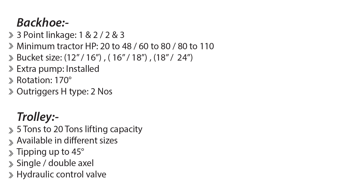 Tractor Backhoe attachment is used for digging, trenching, landscaping and excavating. JIC is manufacturing tractor backhoe series JBH for all available tractor makes in Pakistan. JIC Backhoe is available in 3 models depending on Bucket size and digging options. Hydraulic trolley provides cost effective means of farm transporta-tion. All steel body robust construction trailers provide a selection of sizes from 3.5 to 12 tons. Equipped with jack to lift load.
