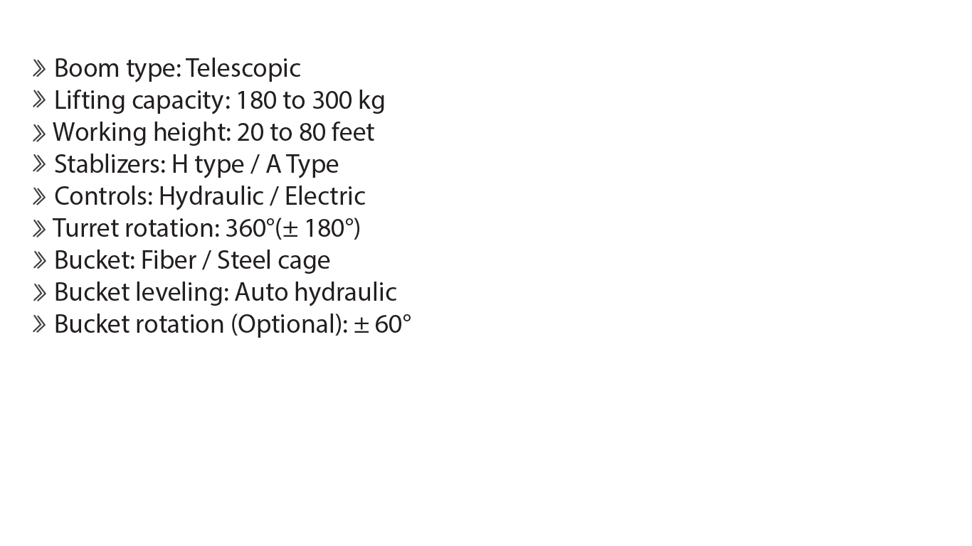JIC Telescopic Boom Aerial Platform superstructure series JPF-T used to provide temporary access for people or equipment to inaccessible areas, usually at height. Aerial Platform are generally used for flexible access purposes such as maintenance and construction work Telescopic Boom Aerial Platform is best solution to achieve desired out-reach. With auto level bucket throughout the aerial platform movement, JIC access platforms with telescopic boom is a perfect and safety combination to work on desired heights (up to 80 feet) of buildings at critical places. We worked a lot on safety factors in Pakistan in access platforms.