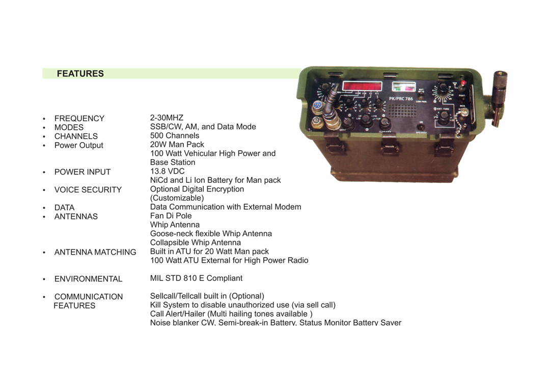 PK/PRC 786 is yet another state of the art development by MEI. Its unique design makes it compatible with all military HF communication requirements. It is simple to use and install unit, available as Low Power Man pack, High Power Vehicular and Base station. It has all the features of modem army requirements like In built Digital Encryption, Data Communication, and ALE operation
